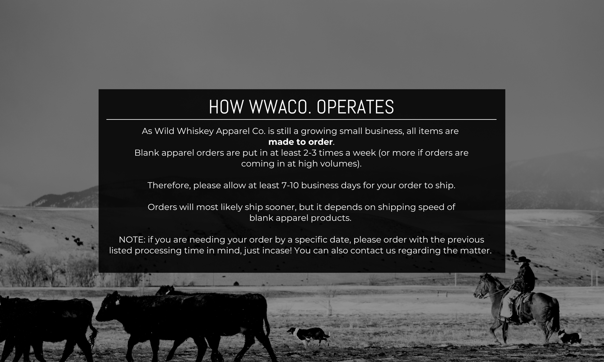 Wild Whiskey Apparel Co. is your one-stop-shop for all things western, blue collar, outdoors, or southern! As of right now, all products are made to order. WWACo. does offer custom orders as well, so be on the look out for those listings.